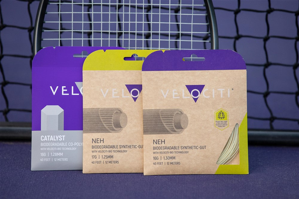 1 Set of Velociti Catalyst or NEH Bio String – Revive your racket with our high-performance, biodegradable string that won’t haunt the environment for centuries.